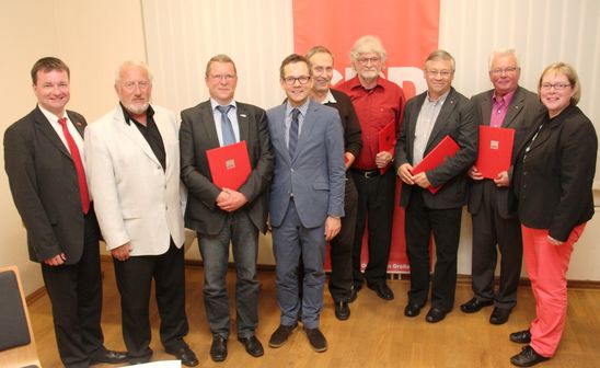 Die Geehrten mit MdB Michael Roth "In diesem Jahr hatten wir soviel zu ehrende Mitglieder, dass wir es sogar aufteilen mussten, um jedem einen würdigen Rahmen zu geben", so begann der Ortsvereinsvorsitzende Karl-Hermann Herbst bei der Jahreshauptversammlung der SPD-Gr0ßenritte.