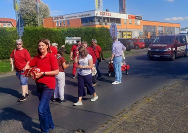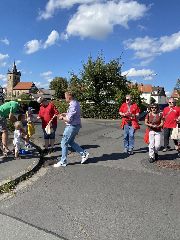 Mit einer Fußgruppe – ausgestattet mit Gummibärchen, Süßigkeiten, Kulis, Einkaufswagenchips, Info-Zetteln und vielem mehr – ging es mit den vielen anderen Gruppen in einem bunten und zuweilen lauten Zug durch Großenritters Straßen.