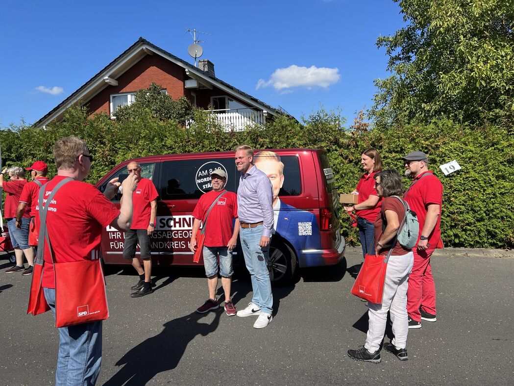 Auch Landtagsabgeordneter Florian Schneider ließ es sich nicht nehmen und war mit seinem Wahlkampfbus und Bollerwagen dabei.